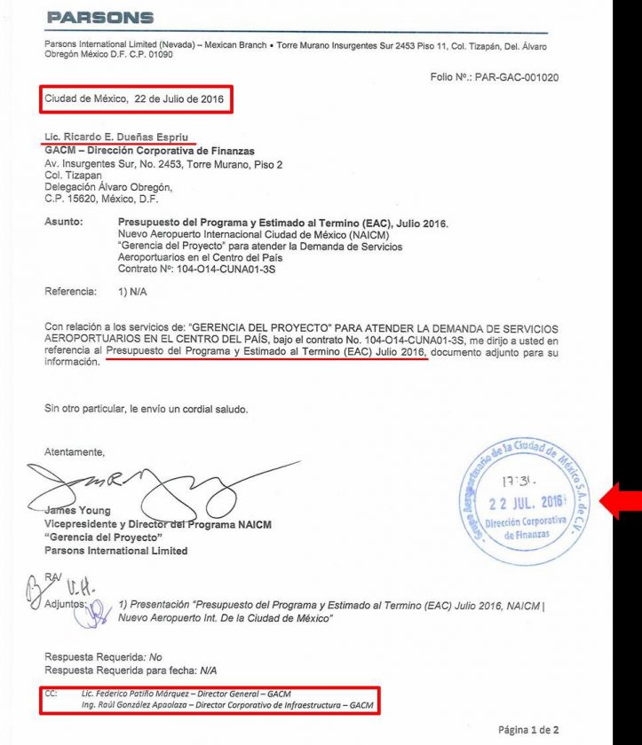 El documento revela un oficio del año 2016, elaborado por Parsons, empresa que llevaba la gerencia del proyecto, presentaba tres escenarios, el primero el anunciado oficialmente, uno que consideraba el real y uno tercero, el peor escenario.