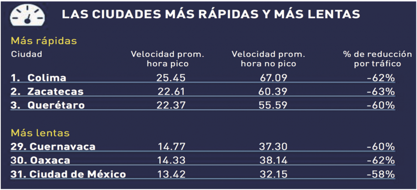 De acuerdo al estudio, las ciudades en desarrollo presentan una mayor eficiencia en los traslados, como sucede en los casos de Querétaro y Culiacán; sin embargo, zonas consolidadas como la Ciudad de México, ocupan el último lugar en el ranking a pesar de su robusta infraestructura vial.