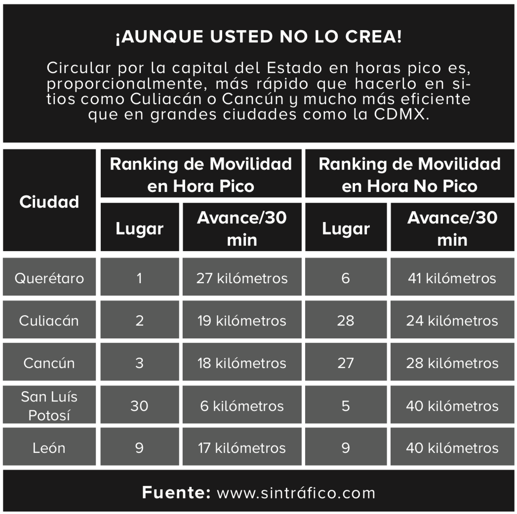 Querétaro ocupó el séptimo lugar entre las ciudades en las que se puede llegar más lejos en momentos que no son horas pico al registrar 41 kilómetros cada media hora, rubro en el que San Luis Potosí y León son las únicas ciudades del bajío que lograron ingresar al top 10 nacional con avances de 40 kilómetros respectivamente.