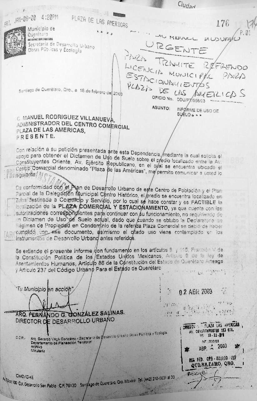 En el oficio que acompaña a la documentación, dirigido a Javier Lozano Dubernard, titular de la Dirección de Desarrollo Económico Municipal, se describen los documentos anexos, entre ellos el informe de uso de suelo en el que se hace constar la factibilidad de la localización de la Plaza comercial y el estacionamiento.