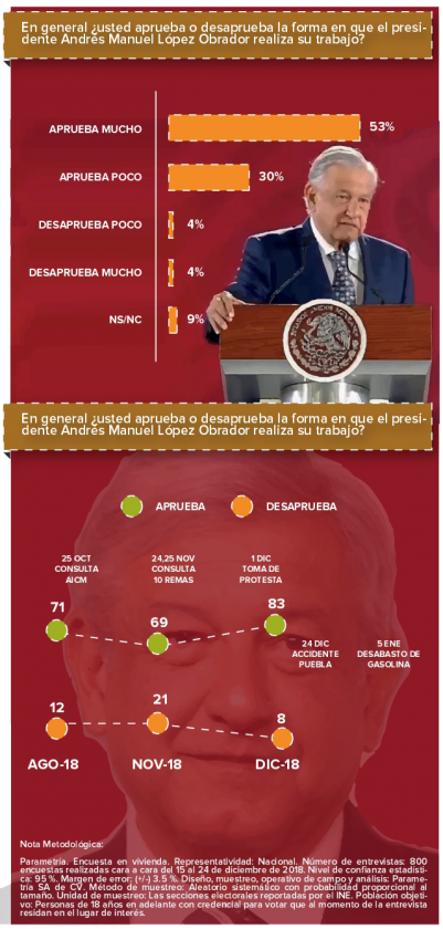 Si bien el saldo de la lucha contra el robo de combustible y la consecuente crisis de abasto de gasolina es incierto todavía, la medición de PARAMETRÍA, que presentamos esta semana y levantada a finales de diciembre de 2018, ocho de cada 10 mexicanos dijo aprobar la forma en que el presidente López Obrador realiza su trabajo, mientras que solo 8 por ciento la desaprueba. Acá la medición completa: