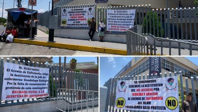Personal de enfermería del Hospital del Niño y la Mujer se manifiesta con lonas