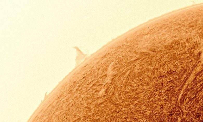 Pude captar una sección del limbo solar donde emergen prominencias: arcos de plasma solar que se elevan por encima de la superficie. A diferencia de las llamaradas solares, que son explosiones intensas de energía y radiación, las prominencias son más lentas y estructuradas, a veces durando días, dibujando bucles magnéticos.