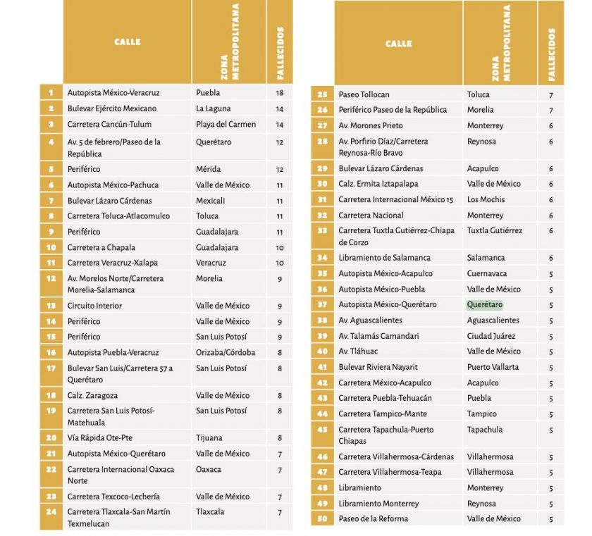 La vialidad más letal fue la autopista México-Veracruz en su paso por la zona urbana de Puebla, con 18 fallecimientos; el Bulevar Ejército Mexicano, en la zona metropolitana de La Lagua, con 14; la carretera Cancún-Tulum en su paso por Playa de Carmen, con 14; y la Av. 5 de Febrero/Paseo de la República, en Querétaro, con 12 fallecidos.