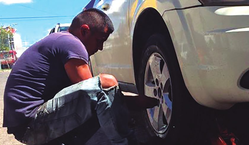 Uno de los vulcanizadores, Pepe conoce la rutina para reparar las llantas a la perfección. Más tarda en estacionarse el vehículo, que el tiempo en que ya está flotando en uno de sus extremos gracias al gato hidráulico que ya ha sido colocado y apalancado por Pepe.