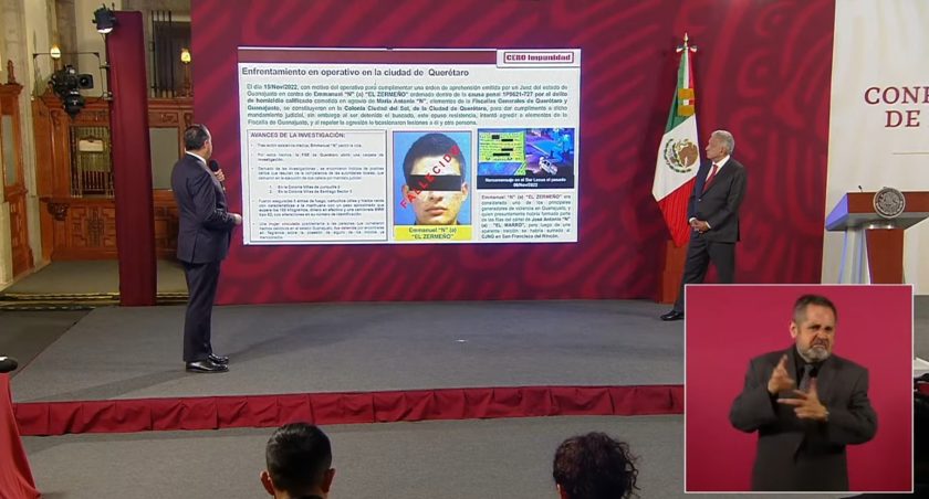 «El día 15/Nov/2022, con motivo del operativo para cumplimentar una orden de aprehensión emitida por un Juez del estado de Guanajuato en contra de Emmanuel «N» (a) «EL ZERMEÑO» ordenada dentro de la causa penal 1P0621-727 por el delito de homicidio calificado cometido en agravio de Maria Antonia «N», elementos de la Fiscalías Generales de Querétaro y Guanajuato, se constituyeron en la Colonia Ciudad del Sol, de la Ciudad de Querétaro, para dar cumplimento a dicho mandamiento judicial, sin embargo al ser detenido el buscado, este opuso resistencia, intentó agredir a elementos de la Fiscalía de Guanajuato, y al repeler la agresión le ocasionaron lesiones a él y otra persona», señala la ficha expuesta por el funcionario federal durante la conferencia «mañanera» en Palacio Nacional.