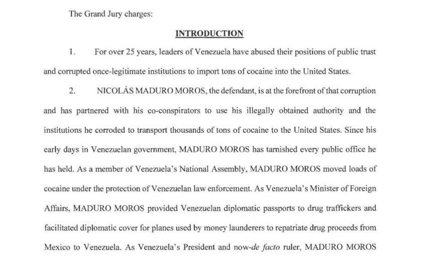 La acusación formal —identificada como Sealed Superseding Indictment S4 11 Cr. 205 (AKH) y presentada ante la Corte del Distrito Sur de Nueva York— sostiene que entre 2006 y 2008, Maduro vendió pasaportes diplomáticos venezolanos a narcotraficantes con el fin de facilitar el traslado de dinero proveniente de la droga entre México y Venezuela sin supervisión de las autoridades.