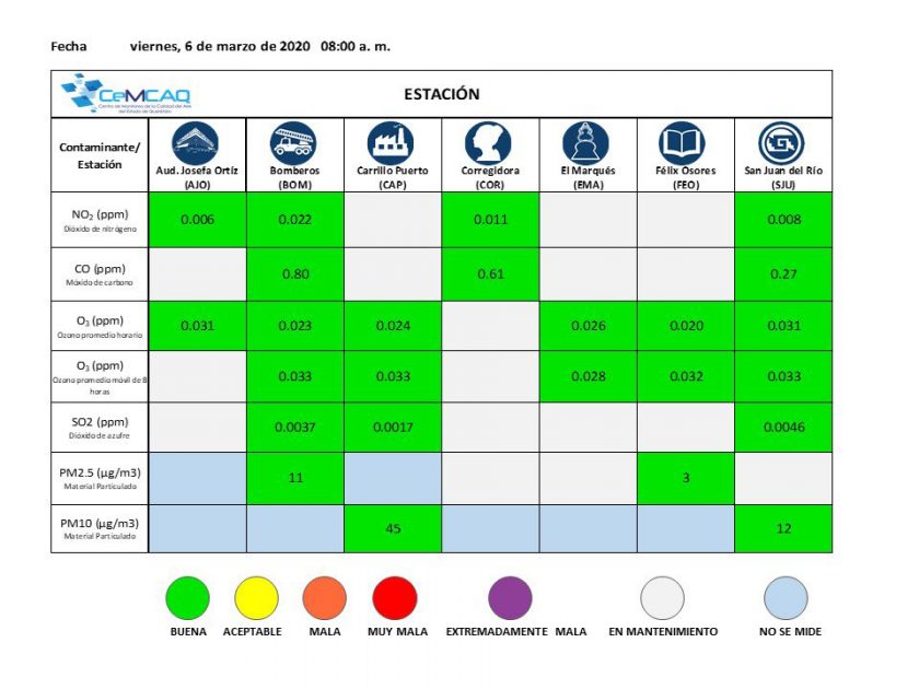 El Centro de Monitoreo de la Calidad del Aire del Estado de Querétaro reportó la mañana de este viernes buena calidad del aire en la estación de monitoreo ubicada en la delegación Felipe Carrillo Puerto de la capital queretana.