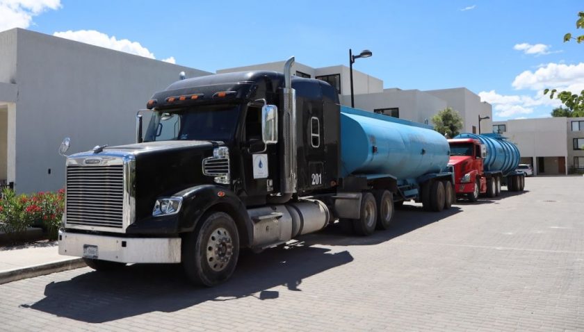 En un recorrido por las instalaciones del condominio, los vecinos señalan la permanente presencia de pipas. Día tras día acuden al conjunto habitacional. Echan a andar bombas para que el agua pase de los autotanques a las cisternas porque no hay conexión con la red de agua potable.