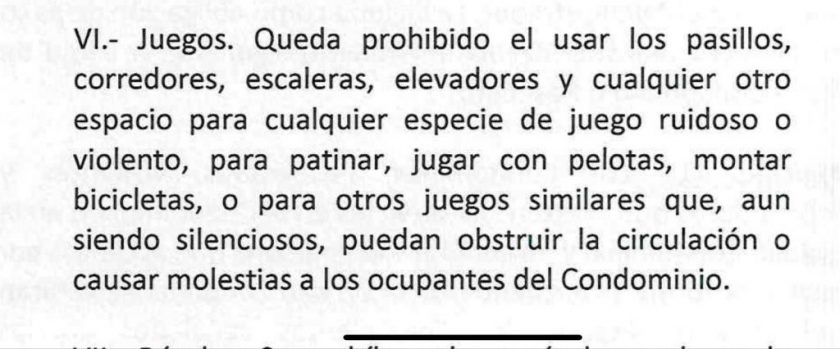 En otro artículo, el reglamento prohíbe usar pasillos, corredores, escaleras y “cualquier otra área” para juegos, incluso silenciosos, lo que en la práctica convierte al condominio en un espacio donde las infancias no pueden jugar ni trasladarse en bicicleta.