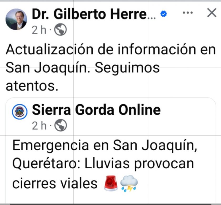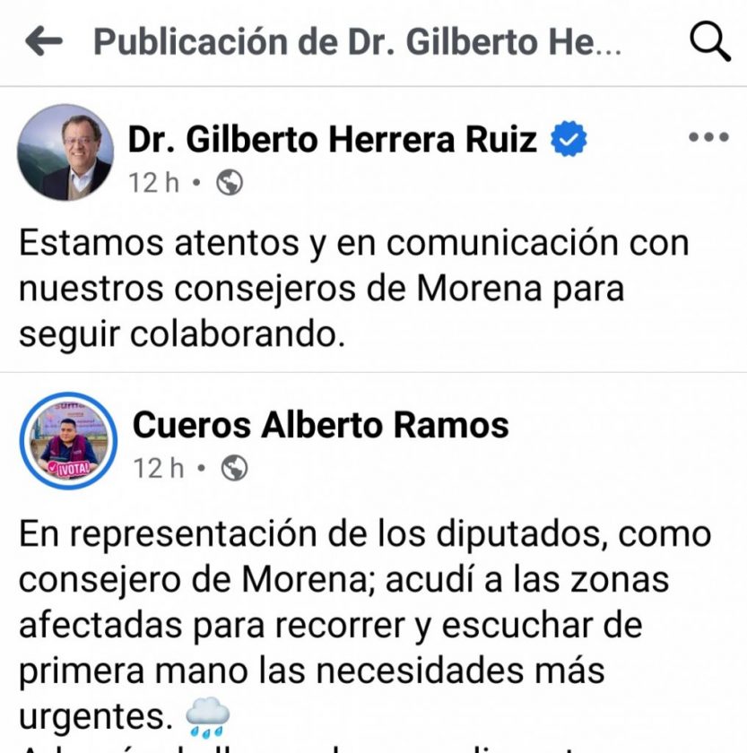 Así es mis ambles lectores, ahora en redes sociales el Diputado Federal Gilberto Herrera, el Pastorcito Evangelizador del otro Querétaro, se ha dedicado en estos momentos de desgracia y desastres naturales que desde el martes 7 de octubre ha azotado y dañado de manera importantes a la Sierra Gorda, mandar a sus emisarios que, a nombre de este farsante, como lo es Alberto Ramos (BETO CUEROS) dos días después de que empezaron las afectaciones a llevar ayuda en alimentos (Col. VIVA), ostentándose como Consejero de morena (con minúsculas) y en representación de Gilberto, para conocer de primera mano las afectaciones, ¿CONOCER QUÉ? los daños y el desastre que ha causado este fenómeno meteorológico está a la vista, Gilberto desde su comodidad de su casa o curul solo dice “estar atento y en comunicación con nuestros consejeros de morena, para seguir colaborando” (comparto captura de pantalla de su perfil).