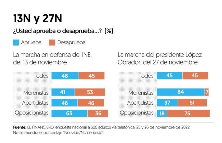Veamos qué nos dicen las encuestas. La encuesta nacional de EL FINANCIERO realizada el 25 y 26 de noviembre preguntó la opinión sobre ambos eventos. Las dos marchas dividieron opiniones: la del 13N en defensa del INE tuvo una aprobación de 48 por ciento y una desparobación de 45 por ciento. La marcha de AMLO del 27N tuvo la aprobación de 45 por ciento justo antes de llevarse a cabo, y una desaprobación de 45 por ciento. Ninguno de los dos eventos tuvo un apoyo mayoritario.