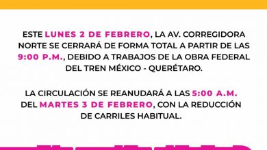 La circulación en avenida Corregidora Norte será cerrada en su totalidad la noche de este lunes 2 de febrero, a…