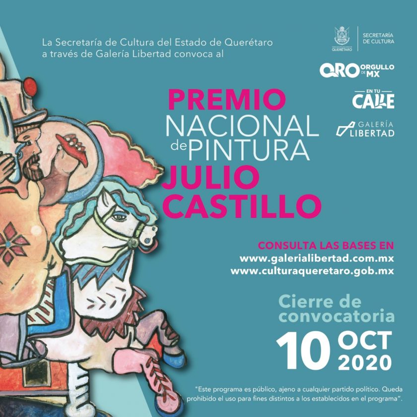 Por otra parte, la convocatoria al Premio Nacional de Pintura Julio Castillo, coordinada por la Galería Libertad, está vigente para recepción de propuestas hasta el 10 de octubre, dirigida a pintores mexicanos que vivan en el país o en el extranjero, así como a pintores extranjeros que comprueben su residencia en México durante los últimos dos años, con un monto asignado de 150 mil pesos para adquisición de la obra ganadora.