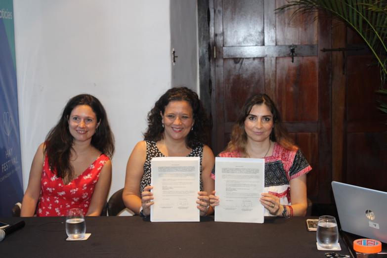 La Secretaria de Cultura del Municipio de Querétaro, Andrea Avendaño, y Cristina Fuentes La Roche, Directora Internacional del Hay Festival, firmaron la carta que refrenda al Municipio de Querétaro como socio principal de este festival cultural que cumplirá cinco años en la ciudad y once en México. Este convenio es de vital importancia para el desarrollo de este evento que lleva a niños, niñas, jóvenes y adultos una variada programación de actividades de primer nivel que celebran lo mejor de la cultura y el pensamiento internacional.