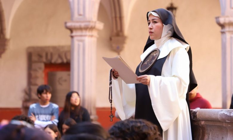 La directora de Poiesis. Compañía de Teatro Femenil Universitaria, Mtra. Mónica Durán Galván, interpretó a la Décima Musa, acompañada por lecturas corales de alumnas y alumnos de la Escuela de Bachilleres plantel Amazcala, quienes declamaron fragmentos de sonetos clásicos de la autora.