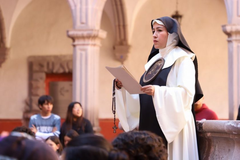 La directora de Poiesis. Compañía de Teatro Femenil Universitaria, Mtra. Mónica Durán Galván, interpretó a la Décima Musa, acompañada por lecturas corales de alumnas y alumnos de la Escuela de Bachilleres plantel Amazcala, quienes declamaron fragmentos de sonetos clásicos de la autora.