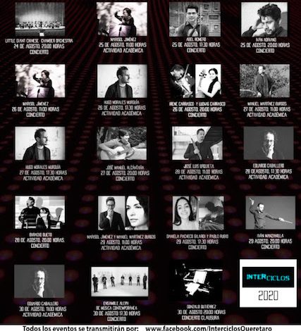 La Universidad Autónoma de Querétaro (UAQ), a través de la Secretaría de Extensión Universitaria (SEU), junto con el colectivo Interciclos, y con apoyo del programa APOYARTE de la Secretaría de Cultura del Estado de Querétaro, llevará a cabo del 24 al 30 de agosto, la segunda edición del Festival Internacional de Música Nueva en Querétaro 2020 “INTERCICLOS”, el cual en esta emisión, será de manera digital derivado de la pandemia que se vive a causa del COVID-19.