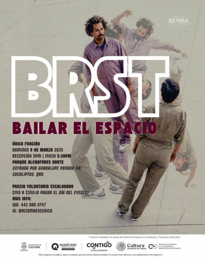 La magia del diálogo entre los cuerpos y el espacio público llegarán el próximo 9 de marzo al Parque Alcanfores de la capital queretana, con la presentación de «Brst: Bailar el espacio», un espectáculo que rompe las barreras convencionales de la danza al utilizar la improvisación como base principal.