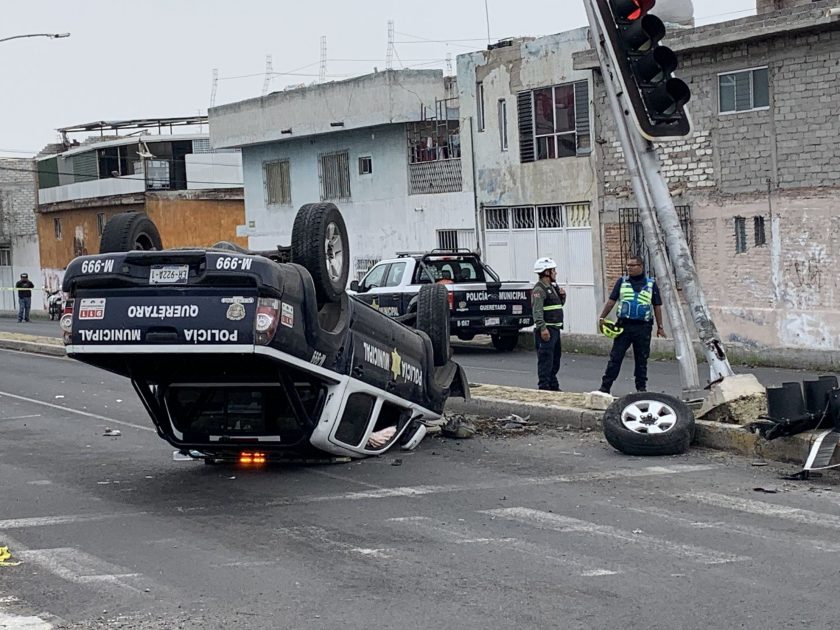 Al mediodía, una patrulla de la policía municipal de Querétaro se vio involucrada en un accidente en la esquina de la avenida 27 y la 4 de la colonia Lomas de Casablanca, al sur de la capital queretana.