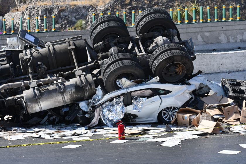 El conductor de un tráiler cargado con cartón, descendía de la pendiente de la Cuesta China en dirección a la capital de Querétaro, cuando perdió el control del volante, brinca la barra de contención y choca contra tres vehículos en sentido opuesto.