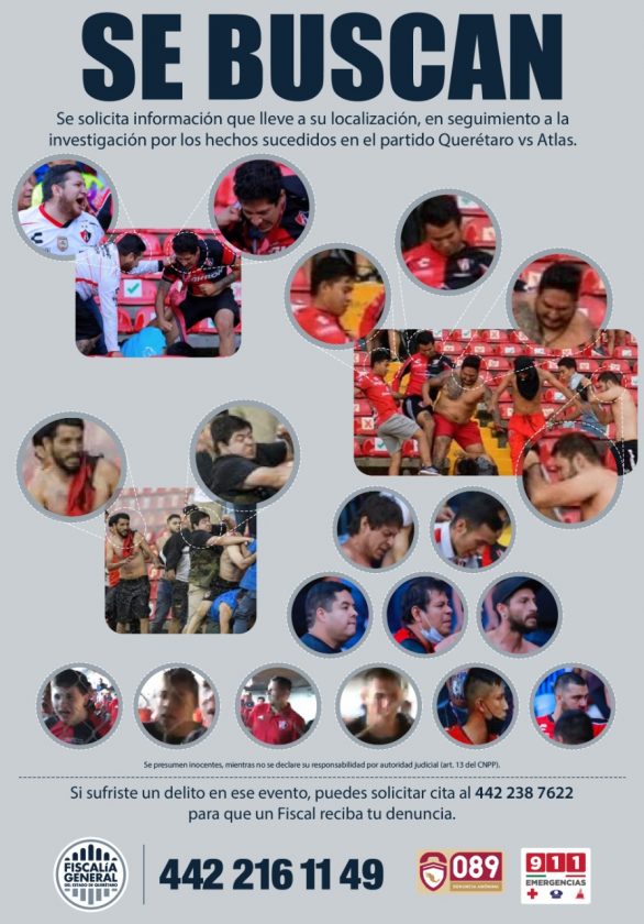 De igual modo, al continuar las investigaciones se ha logrado identificar a otros intervinientes de los hechos ocurridos el 5 de marzo en el estadio La Corregidora. Por ello, se solicita la colaboración de la ciudadanía para que quien cuente con información que pueda ayudar al paradero de estas personas, la proporcione al 442 238 7622 o al 442 216 1149. Dicha información es confidencial por disposición legal.