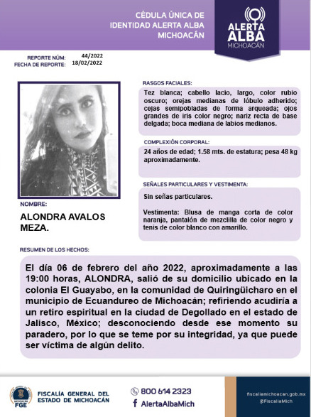 paradero, por lo que se teme por su integridad, ya que puede ser víctima de algún delito”, se se especifica en la Cédula Única de Identidad Alerta Alba Michoacán com reporte número 44/2022, con fecha 18/02/2022.