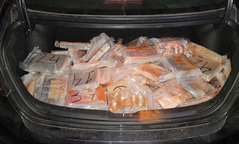 Conforme al protocolo de actuación policial, se le efectuó una revisión de seguridad, tras la cual, en la cajuela del vehículo color gris con placas de circulación del estado de Guerrero, hallaron 69 bolsas de plástico selladas al vacío con una sustancia amarillenta similar a la cocaína, con un peso aproximado de 69 kilogramos y un arma de fuego corta abastecida con seis cartuchos útiles.