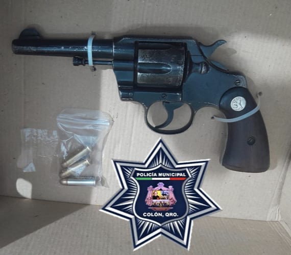 La Policía Municipal de Colón informó que, derivado de los trabajos de prevención y disuasión, se aseguró a un masculino que portaba un arma de fuego tipo revolver, la cual se encontraba abastecida con 3 cartuchos al parecer calibre .38.
