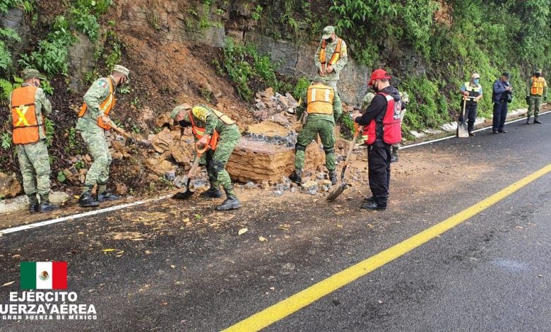 Elementos del Ejército Mexicano atendieron el deslave de un cerro en la carretera federal 120 San Juan del Río – Xilitla, a la altura de la comunidad de Tres Cruces, municipio de Pinal de Amoles, Querétaro.