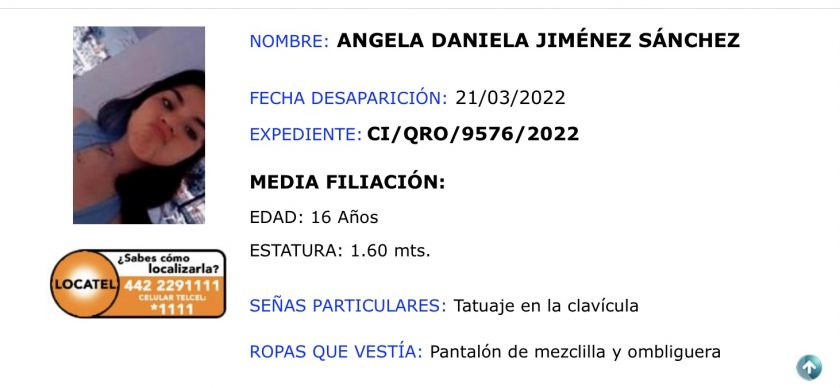 El 31 de marzo la Fiscalía General del Estado de Querétaro recibió la denuncia por la no localización de la adolescente, 10 días después de la última vez que fue vista por su mamá