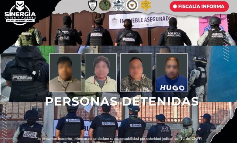 La Fiscalía de Querétaro, a través de la Unidad Especializada en Investigación de Narcomenudeo y bajo el despliegue operativo de Sinergia por Querétaro, realizó cinco diligencias de cateo en los municipios de Querétaro y El Marqués. Como resultado, fueron detenidas cuatro personas vinculadas a posibles delitos contra la salud y se aseguraron armas largas, dinero en efectivo y múltiples dosis de narcótico.