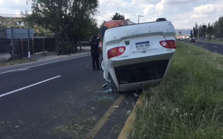 Un vehículo de la marca Toyota, terminó volcado en el Libramiento Norponiente a la altura del fraccionamiento Verona, km 25, dirección SLP, en donde el conductor y su acompañante resultaron con lesiones menores, después de que un tráiler provocara que perdiera el control del volante y terminara en el camellón central volcado y con las llantas hacia el cielo.