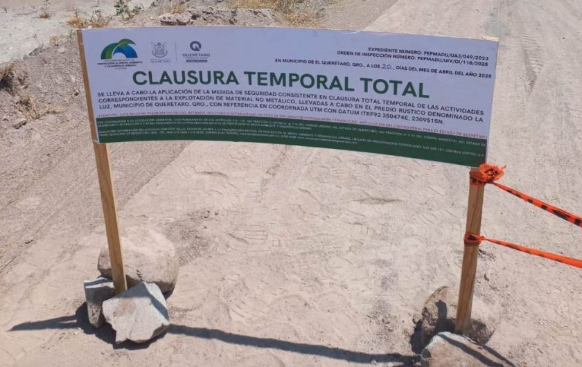 En atención a denuncias ciudadanas, inspectores de la Procuraduría Estatal de Protección al Medio Ambiente y Desarrollo Urbano (PEPMADU) realizaron la clausura total temporal de un banco de materiales ubicado en el municipio de Querétaro.