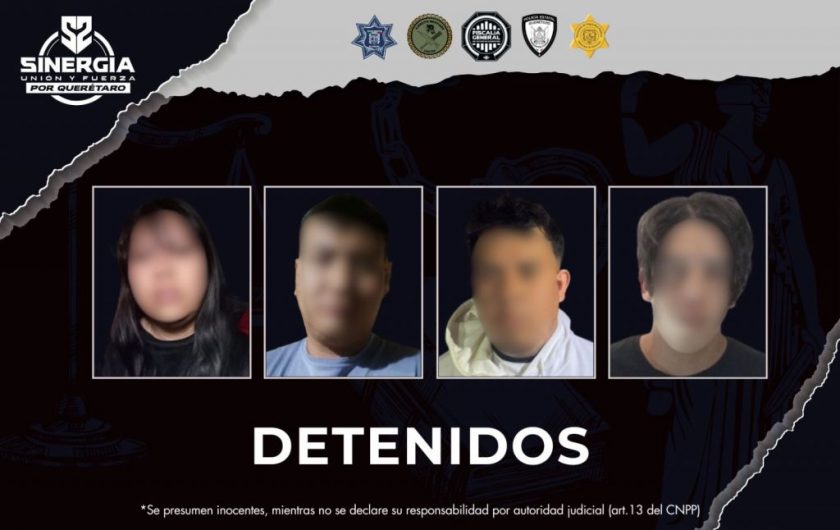 La Fiscalía General del Estado de Querétaro ejecutó cuatro cateos de manera simultánea en los municipios de Querétaro y El Marqués, en el marco de la estrategia Sinergia por Querétaro, logrando la detención de cuatro personas.