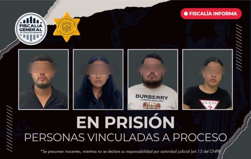 La Fiscalía de Querétaro obtuvo la vinculación a proceso de cuatro personas —dos hombres y dos mujeres— por su probable intervención en el delito de robo equiparado de vehículo, tras ser aseguradas mientras conducían dos camionetas con reporte de robo vigente.