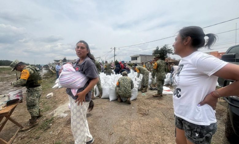 Este martes, los soldados y pobladores llenaron costaleras para formar un gran dique que impidiera nuevas inundaciones ante el riesgo de nuevas lluvias.