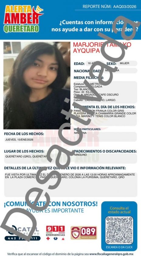 Las Alertas Amber de Citlali Perez Oria, Carmen Esmeralda Mendieta Oviedo y Marjorie Tamayo Ayquipa han sido desactivadas por la Fiscalía General del estado de Querétaro. Esto no significa que hayan sido localizadas, sino que continúa su búsqueda con aplicación de otras herramientas y métodos de investigación.