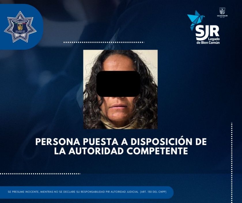 Elementos de la SSPM-SJR realizaron la detención de una mujer por el delito de lesiones calificadas, luego de ser señalada como responsable de atacar con un arma blanca a un hombre en la Colonia El Carrizo.