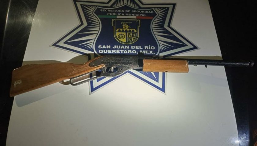 Oficiales de la Secretaría de Seguridad Pública Municipal, realizaron la inspección al masculino identificado como Gael “N” de 19 años, originario de la Ciudad de México, y encontraron que el sujeto portaba un arma tipo carabina, marca Mendoza, serie jet50, culata color café, sin municiones.