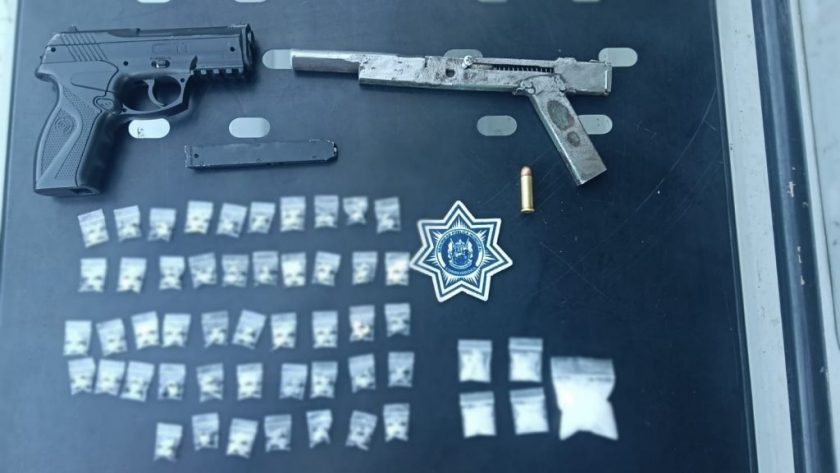 Tras realizar una entrevista preventiva y una inspección de seguridad, se localizaron entre sus pertenencias más de 50 dosis de una sustancia con características de probable narcótico, así como un objeto con apariencia de arma de postas y un arma de fabricación artesanal.