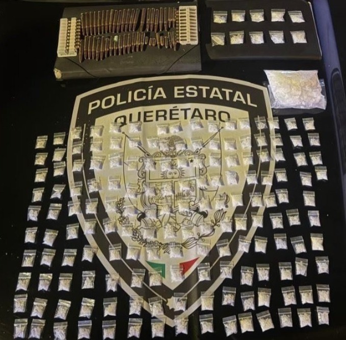 Se halló una bolsa con cerca de 250 gramos de aparente metanfetamina, además de más de 150 bolsas pequeñas con sustancias ilícitas. También, más de 60 cartuchos útiles de diferentes calibres.