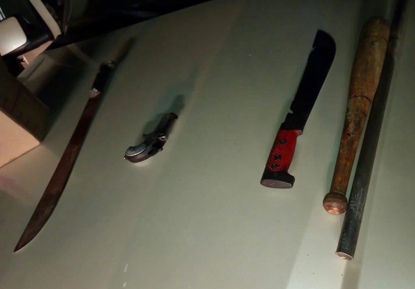 Tras la revisión se les localizó un arma de fuego, cartuchos útiles, un bate de madera, dos armas blancas (machetes), así como un tubo de metal, procediendo a la detención inmediata de Uriel Antonio “N”, Sergio Arturo “N”, Ángel Alberto “N”, Christian Daniel “N”, Eduardo “N” y Benigno “N” por el delito de portación de arma de fuego sin licencia.