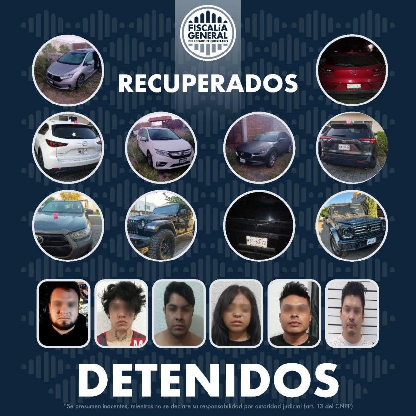 La Fiscalía General del estado, informó que, 10 vehículos fueron recuperados al realizar 7 cateos en los municipios de Querétaro y Corregidora; por estas acciones de investigación se detuvo a 6 personas. La operatividad fue en conjunto con las policías municipales.