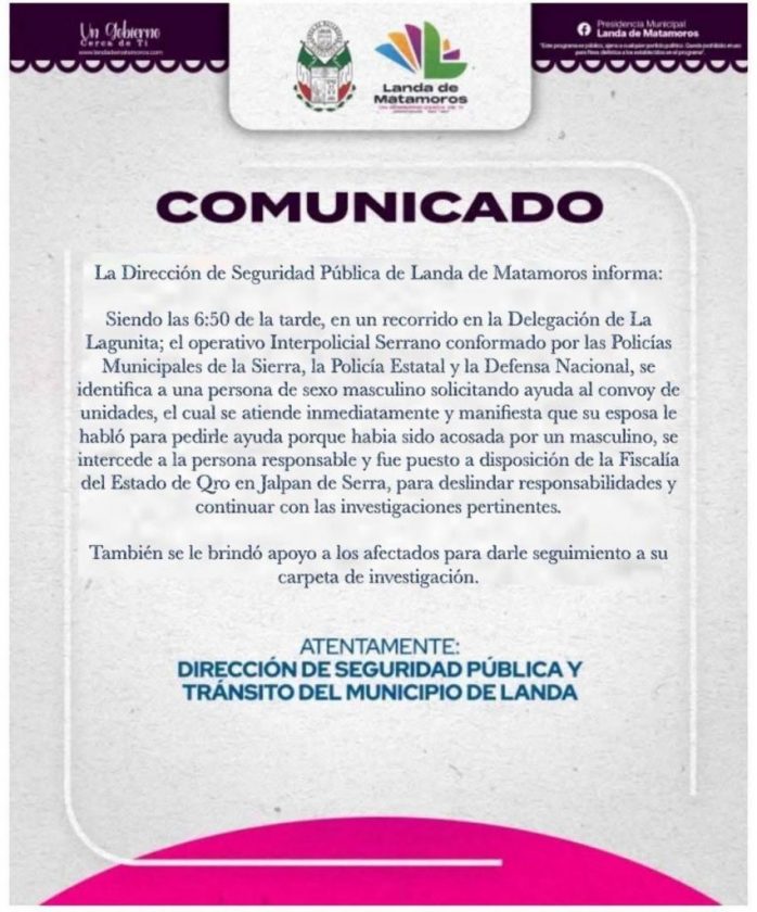 La Dirección de Seguridad Pública y Tránsito del Municipio de Landa de Matamoros informó la detención de César N., quien se desempeñaba como coordinador de Atención a Migrantes en el Ayuntamiento, por su presunta participación en un caso de acoso contra una mujer.