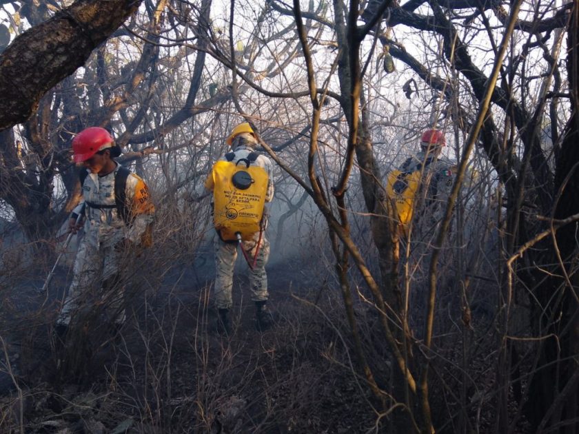En coordinación con autoridades de los tres órdenes de gobierno, integrantes de esta fuerza de seguridad pública, por medio de guardarrayas y brechas corta fuego cubrieron los puntos de calor que siguen activos en el lugar, con el objeto de evitar que las llamas se extiendan a las zonas aledañas.