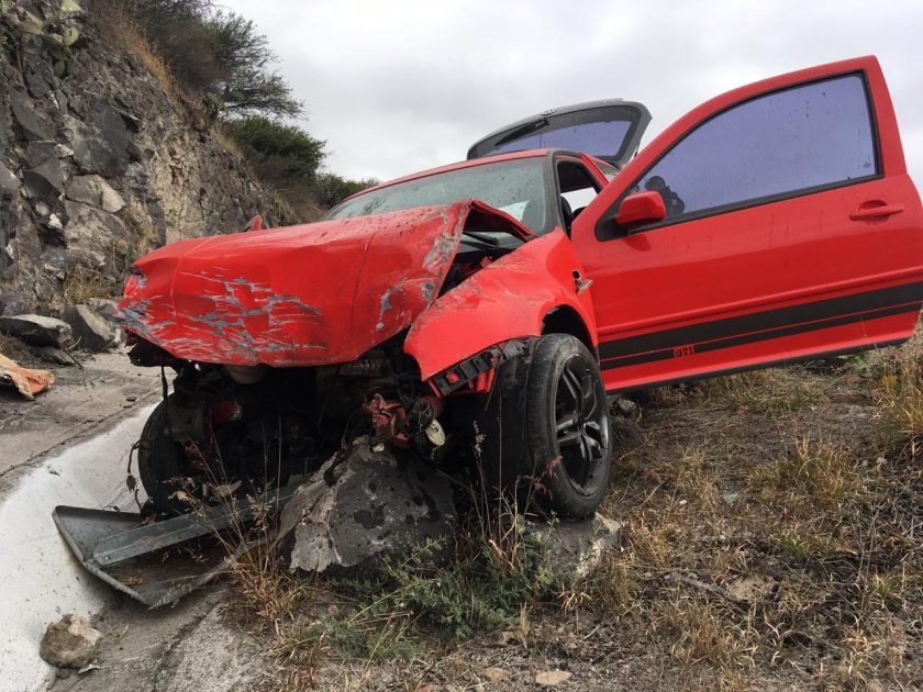 El conductor de un Golf, conducía su unidad a exceso de velocidad sobre el libramiento Norponiente en dirección a Mompaní, cuando al tomar una curva perdió el control del volante, sale de la carpeta asfáltica, comienza a volcar, perdiendo el motor de su unidad, derribando un señalamiento vial y terminando su paso en una canaleta.