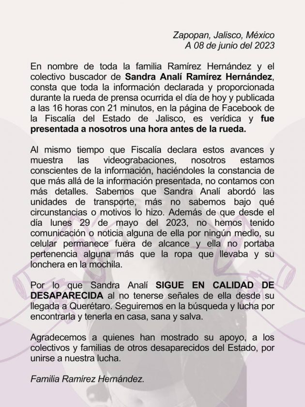 A pesar de contar con esta información, Sandra Analí aún no ha sido localizada, por lo que la investigación continúa en conjunto con la Fiscalía de Querétaro. La carpeta de investigación cuenta con 85 registros y se han realizado operativos de búsqueda diarios, despliegues terrestres y aseguramiento de dispositivos electrónicos que proporcionaron material gráfico crucial para el caso.