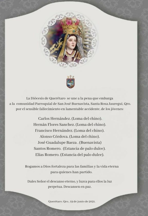 La Diócesis de Querétaro dio a conocer los nombres de los siete jóvenes que se accidentaron esta madrugada en la carretera 111 Querétaro – San Miguel de Allende, donde casi de manera inmediata perdieron la vida, al impactarse contra un trailer en una de las curvas, ubicada en el km 6+500 aproximadamente, pasando la parada de autobuses de La Cañada.