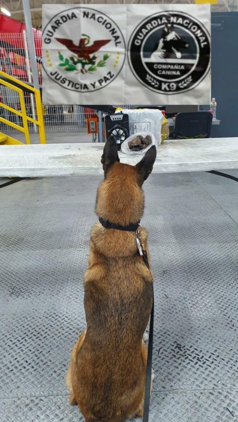 En el área de paquetería de dicho recinto aeroportuario, guardias nacionales realizaban inspecciones de seguridad con apoyo de un ejemplar canino, el cual modificó su conducta al olfatear una bolsa de plástico.